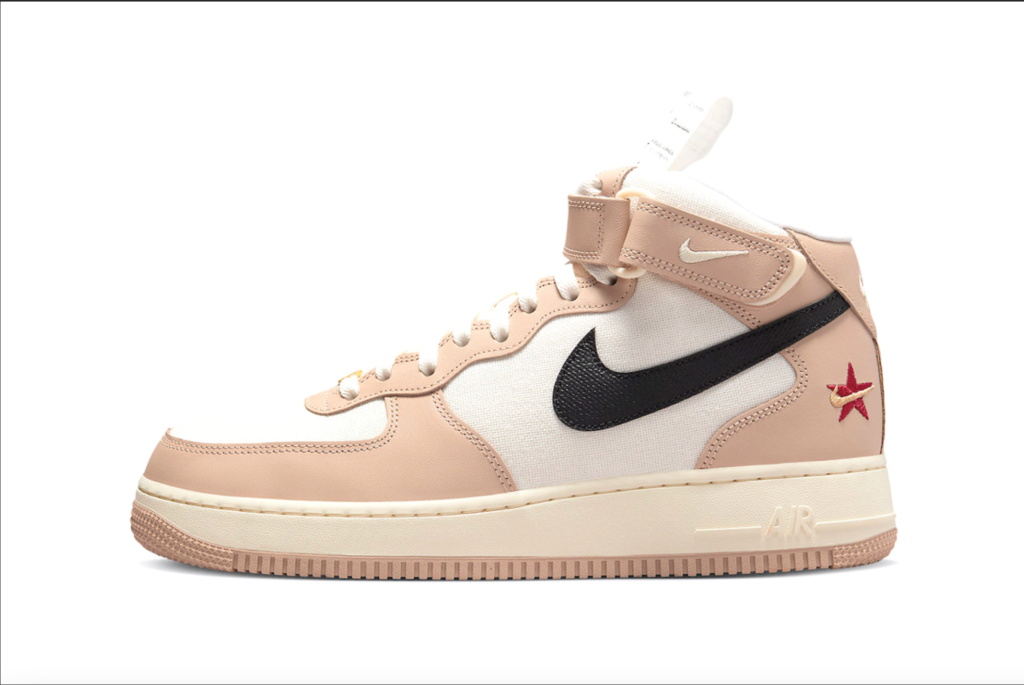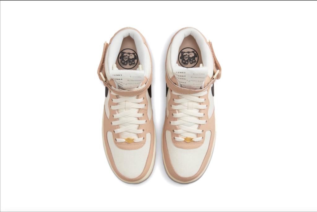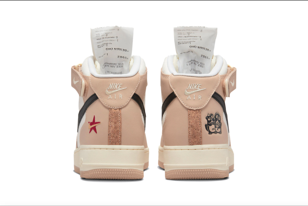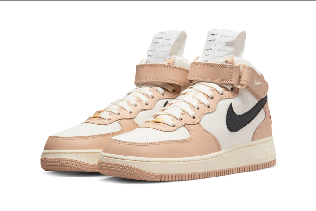 Nike Air Force 1 Mid’in bu modelinde, Tan rengi deri yüzeylere sahip krem kumaş kanvas taban, Sail orta taban üzerinde Siyah deri Swoosh’lar ve Tan rengi kauçuk dış taban bulunuyor. Ayakkabının öne çıkan özelliği; dillerdeki çıkarılabilir zaman çizelgesi fişi, bu fiş bize geçmişten günümüze kadar olan her tasarımın detaylarını veriyor. Diğer dikkat çekici ayrıntılar arasında, ayakkabının sol yan bileğindeki işlemeli Star/Swoosh motifi, ayakkabının sağ yan bileğinde ve iç tabanlarında da görülen eğlenceli bir kunduz illüstrasyonu yer alıyor.