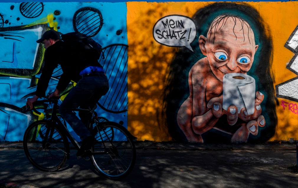 Berlinli sanatçı Eme Freethinker; Yüzüklerin Efendisi’nin Gollum’unu, tuvalet kağıdı rulosu ve “Mein Schatz” (Benim Kıymetlim) notuyla işlediği duvar resmi, karantina süresi boyunca insanların sergilediği tüketim çılgınlığını alaycı bir yaklaşımla öne çıkarıyor. Pandeminin ortaya çıktığı dönemlerde tüm dünyada anlamadığımız bir şekilde tuvalet kağıdı çılgınlığı yaşanmıştı. Öncelikler düşünüldüğünde tuvalet kağıdı zihnimizi zorluyor…