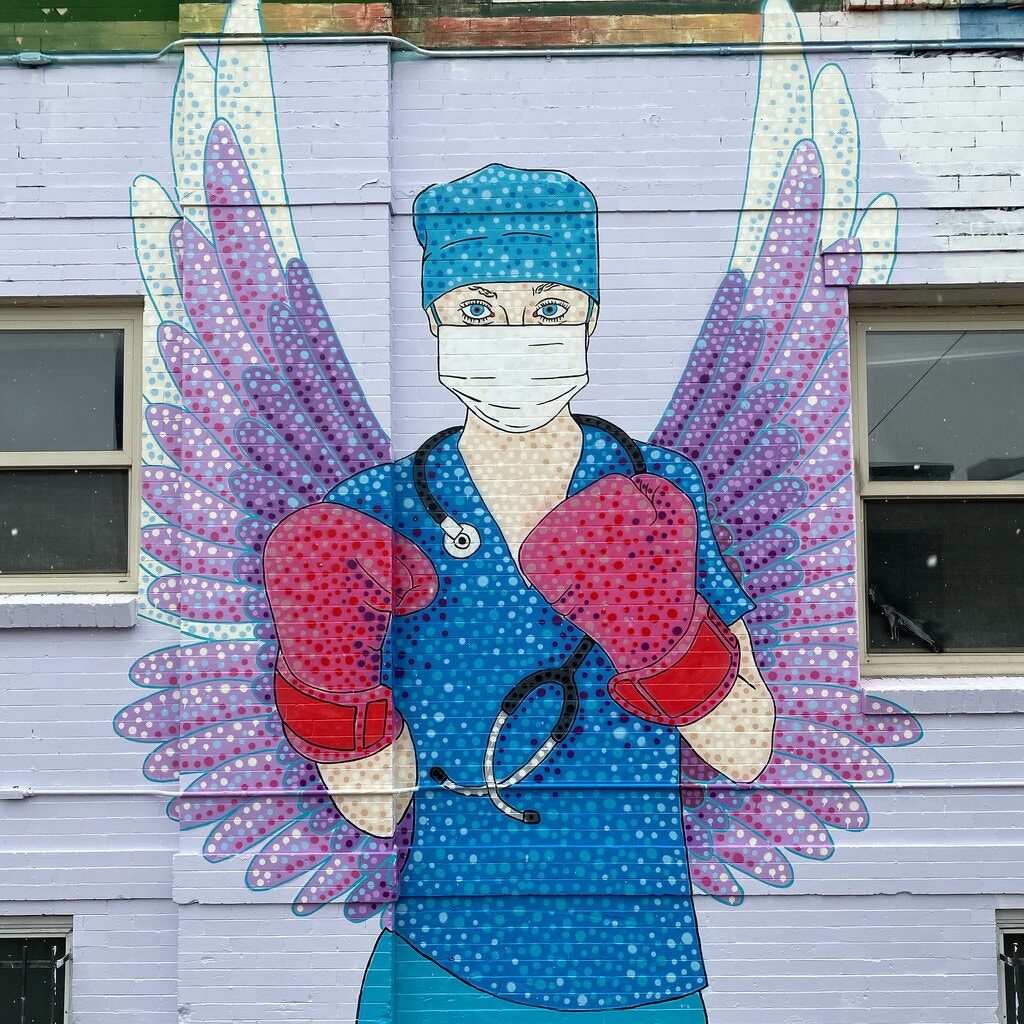 10 Nisan’da Denver merkezli sanatçı Austin Zucchini-Fowler, Colfax Bulvarı’ndaki terk edilmiş bir binanın duvarına dikkat çekici, çok renkli bir “Sağlık Kahramanı” mural çalışması yaptı. Duvar resmi, yüz maskesi ve bir çift kırmızı boks eldiveni giyen kanatlı bir sağlık çalışanını gösteriyor. Boks eldivenleri, sağlık çalışanlarının gücünü; melek kanatları ile ise insanlığa iyilikleri ile dokunmalarını temsil ediyor. Tamamlanması 10 saatten az süren duvar resmi için sprey ve akrilik boyaların bir karışımı kullanıldı.