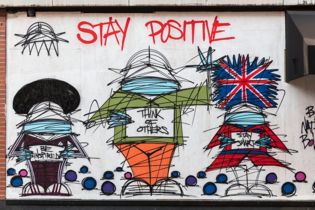 “İlham Al”, “Başkalarını Düşün” ve “Akıllı Kal” yazılı mottolar ile Sanatçı Nathan Bowen, izolasyon sürecinde kendine özgü eskiz stili ile işlenmiş, iyimser duvar resimleriyle Londra’yı renklendirmeye başladı. Ayrıca Londra’nın birçok yerinde yer alan pozitiflik posterleri ön plana çıkıyor. Güçlü yazı karakterleri ve parlak renkleriyle Mark Titchtner’ın çalışması Dünya’ya, bir umut çığlığı olarak yaşadığımız sıkıntıların geçici ve akışkan olduğunu ve her zaman değiştiğini duyuruyor.