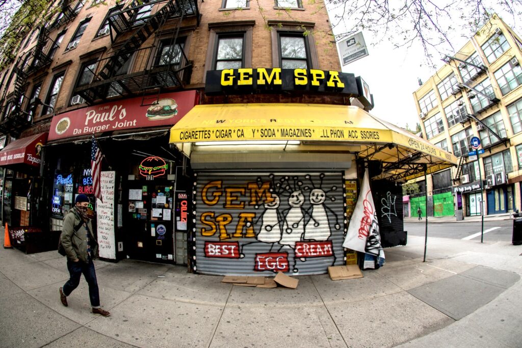 Pandemi sırasında birçok işletme kapılarını kapatma durumunda kaldı. East Village’da konumlanan şekerci dükkanı olan Gem Spa, salgın öncesi de ekonomik sıkıntılarla mücadele ediyordu ve 9 Mayıs itibariyle kalıcı olarak kapanmıştı. Çelik kapılar üzerine yapılan grafitti, 1950’lere kadar farklı bir isimle, 1920’lerden beri açık olan Gem Spa için özel düşünülmüş. Dükkan kapalı olsa da eski müşterilerine veya hiç uğramamış olan insanlara yine de mağazayı tanıtmanın güzel yollarından biri..